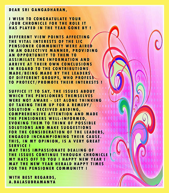 Coming to OROP, LIC pensioners and also those in banking sector should remember that they are governed by 'funded scheme'. That is precisely the reason for our decision in the recent EC to think of chalking out a comprehensive and realistic plan, after the decision is known in the forthcoming hearing of our case in the SC on 14th Jan. Let the New Year be the answer for our way forward.
